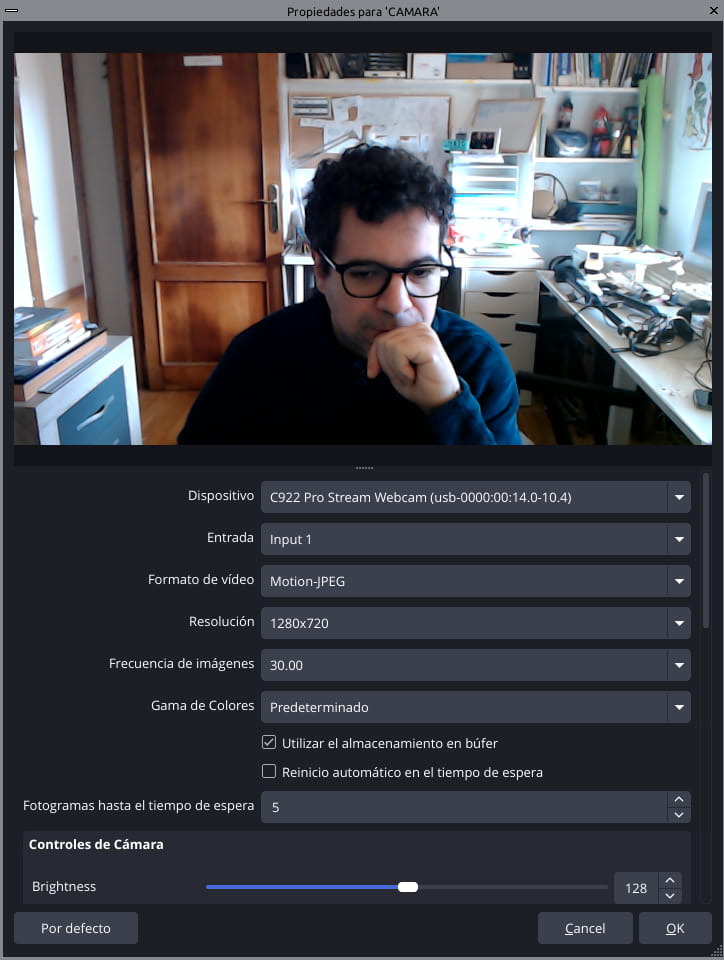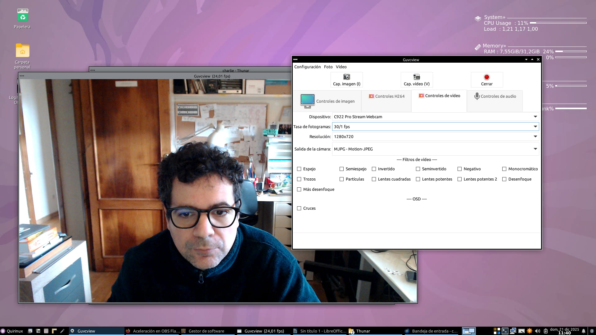 El programa que utilizamos en Quirinux para configurar la cámara web es guvcview. Las configuraciones que realicemos ahí luego son reflejadas por las demás aplicaciones.